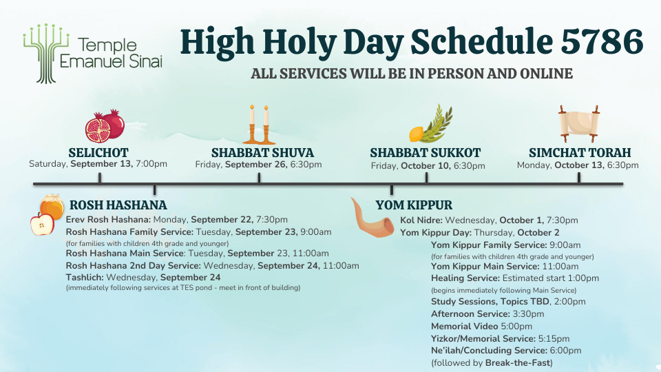 The High Holy Days are a time for reflection, introspection, prayer, and re-connection. Temple Emanuel Sinai offers a variety of services for children and adults to meet the spiritual needs of our diverse community. We invite you to join us in celebrating and observing these special Holy days.